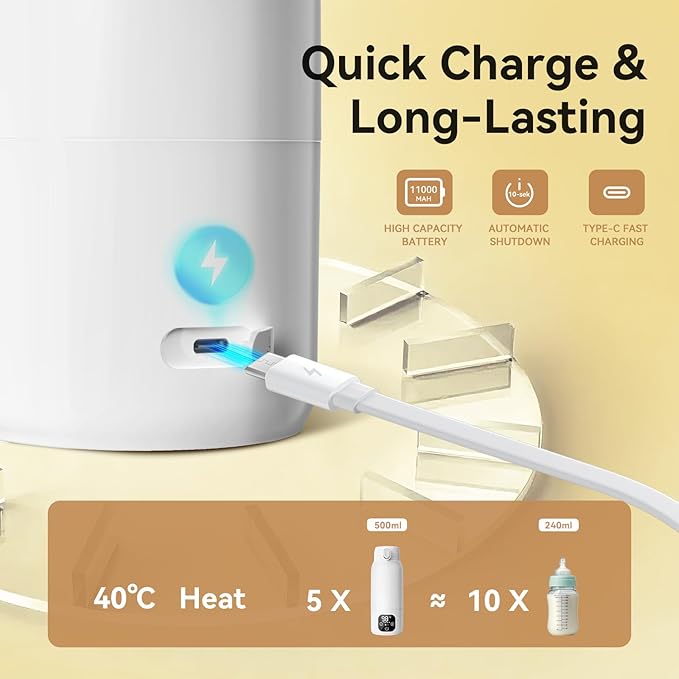 - 【Long-Lasting Battery & Ultra-Fast Charging】Equipped with a high-capacity 11000mAh battery, this travel essentials portable bottle warmer delivers up to 5–7 uses on a single charge. With included fast USB-C charging. Perfect portable baby bottle warmer for camping and nighttime feedings