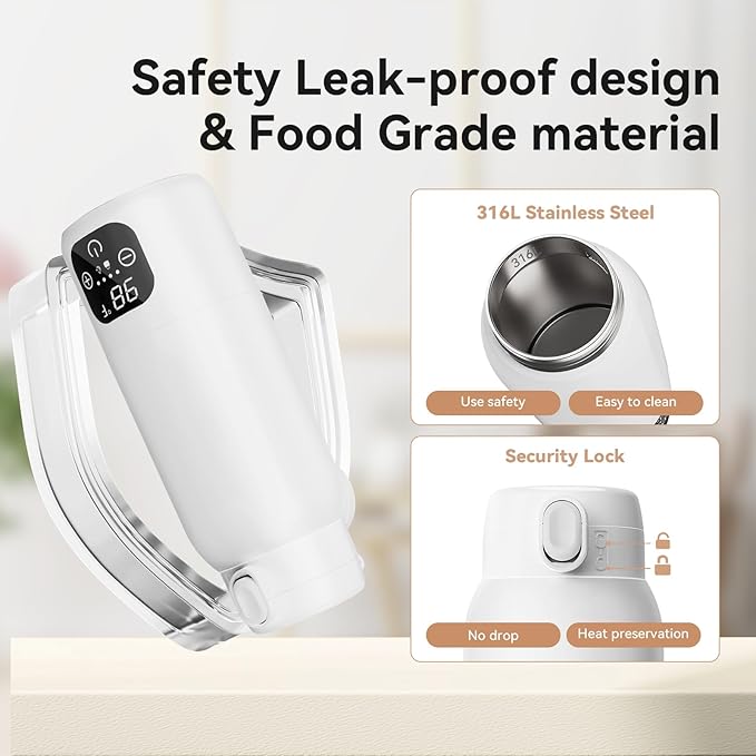 - 【High-Quality Premium 316 Stainless Steel】The inner chamber is crafted from odor-resistant, food-grade 316 stainless steel, ensuring no plastic taste or health risks. The portable bottle warmer by a secure, leak-proof lid and a child-lock safety cap to prevent spills and accidental openings. Trust that every meal is warm, safe, and pure
