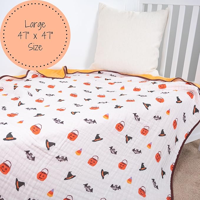 - HALLOWEEN PRINT - Festive pumpkins, bats, and witch hats decorate this baby quilt, bringing seasonal fun to every cuddle. Crafted from soft muslin, it keeps your baby cozy from fall through winter