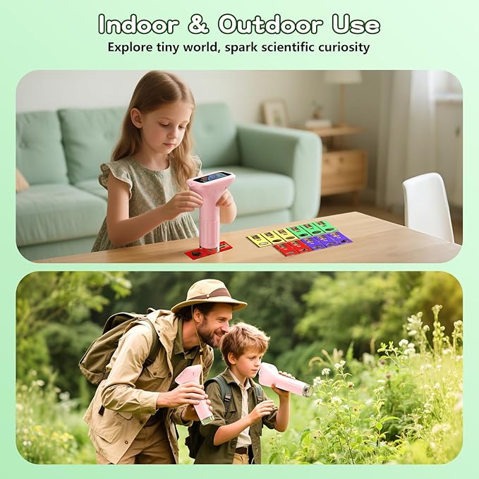 - Portable Design for Kids: Specifically designed to fit small hands, making the mini microscope comfortable and easy to hold. Buttons positioned on top allow kids to easily observe and operate at the same time. Includes a lanyard for hanging around the neck or on a backpack, ensuring effortless portability. A built-in rechargeable battery offers long-lasting power, great for both outdoor exploration and everyday learning