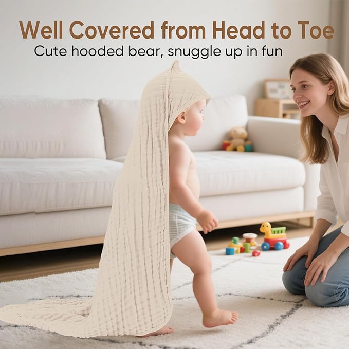 - 【Unrivaled Durability】 Our hooded baby towels feature a robust 6-layer muslin design. Each towel can easily wrap the baby's head and body, providing better coverage after bath time, giving the baby comprehensive warm care .These towels are designed to accommodate newborns, infants, toddlers, and young children up to 3 years old.