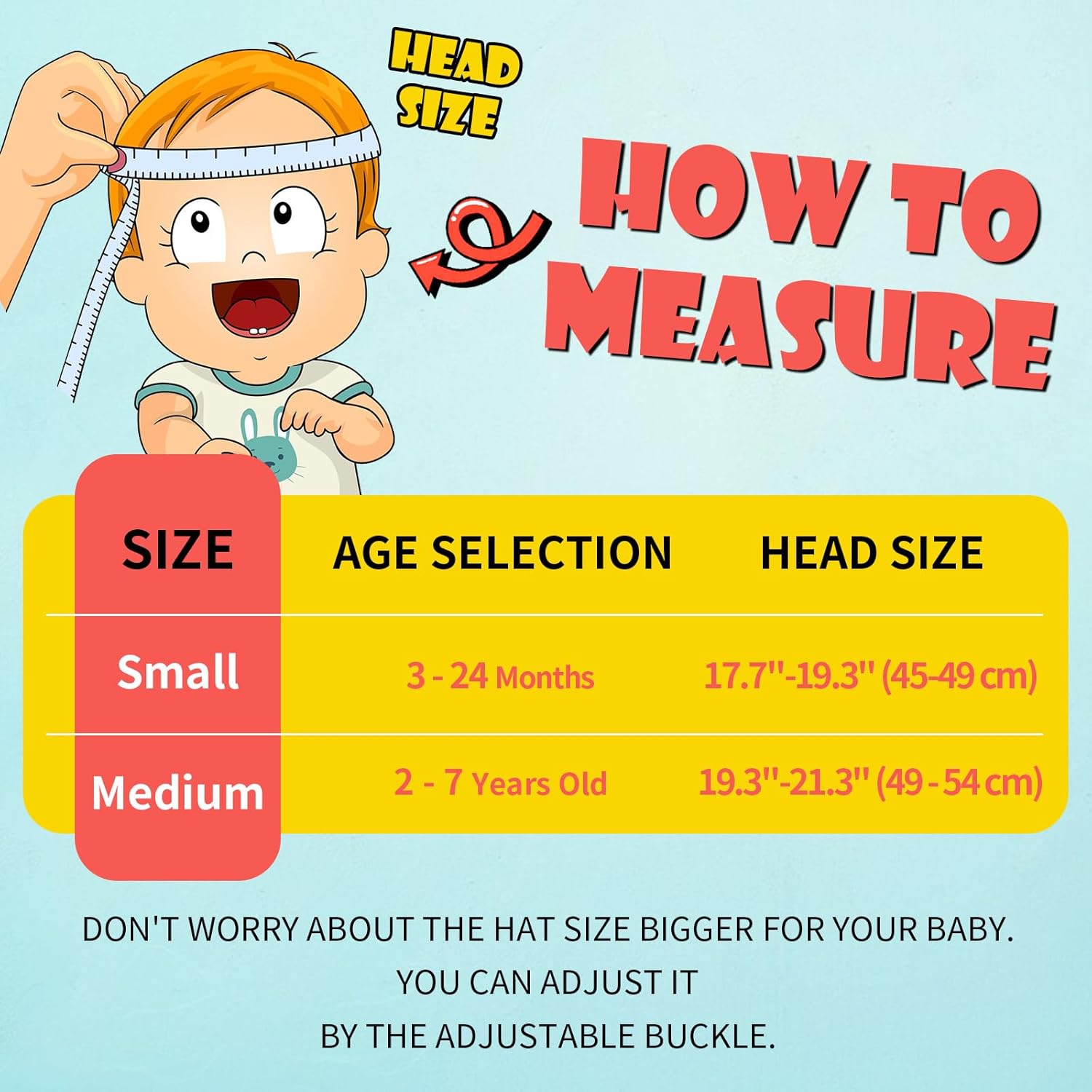 - ADJUSTABLE TO GROW WITH KIDS: Sun hat for kids has two sizes: Size S: 3-24 months fits head circumference 17.7"-19.3"; Size M: 2-7 years fits head circumference 19.3"-21.3". The stretchy headband and rope buckle behind the sunshade hat can adjust the head circumference for a comfort fit. Great for your toddler boy or toddler girl, and big kids too! So, this durable infant hat will definitely grow with your kids for a long time