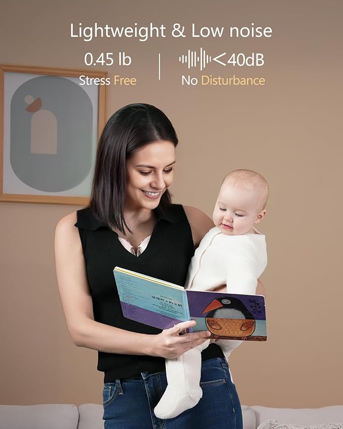 - More Quiet & Lightweight: Our electric breast pump weighs only 0.45 lb/203 g and runs at under 40 dB, so you can pump discreetly. The low noise won't disturb a sleeping baby and protects your privacy in public. Ultra-lightweight and compact, it's easy to use in-bra and lets you breastfeed while multitasking.