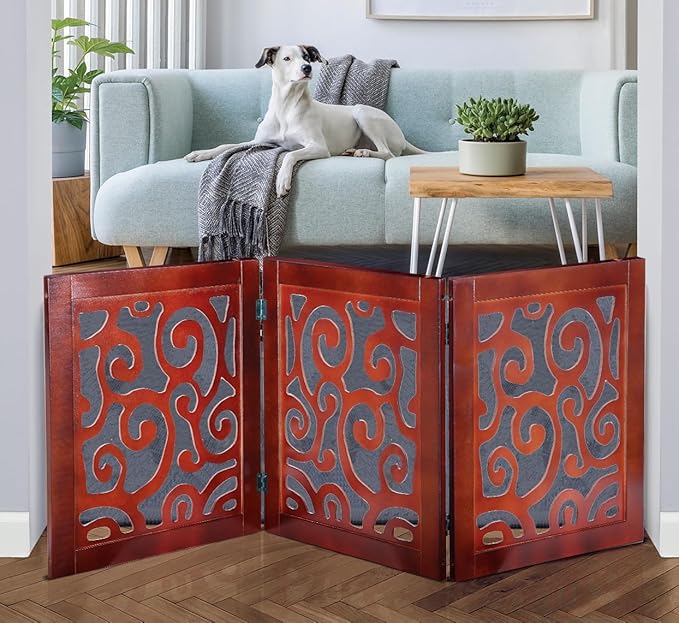 Bundaloo Freestanding Dog Gate Expandable Decorative Wooden Fence for Small to Medium Pet Dogs, Barrier for Stairs, Doorways, & Hallways (Mehagony Scroll)