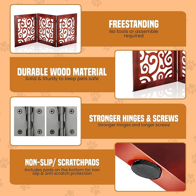 - MODERN DESIGN SELECTION - We carry multiple decorative designs for our freestanding pet gate collection, to blend well with any room decor. The Patterned cut outs look classy and ideal for its purpose.