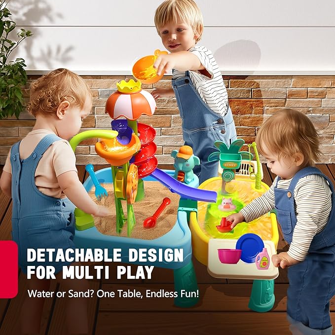 - 4-in-1 Water and Sand Play Table:This water table combines fishing, a mini water park, pretend kitchen play, and a sand basin in one! Kids can switch between dry and wet activities, encouraging creativity, sensory development, and group play. Perfect for keeping your kids engaged indoors or out with endless ways to explore and pretend.