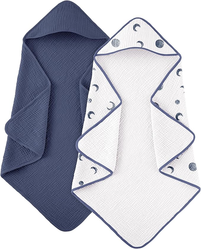 Susurration Hooded Baby Towels for Newborn 2 Pack 100% Muslin Cotton Towel for Babies,Highly Absorbent and Newborn Essential 30x30 Inch Moon&Royal Blue