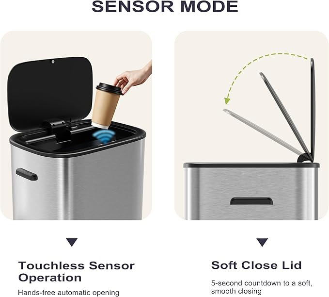 - Motion Sensor Trash Can - Built-in infrared sensor detects hand movement within 7.9 inches, 0.1 seconds senses hand movement and automatically opens the lid, the touchless trash bin can automatically close the lid if no object movement is detected within 5 seconds,providing a hands - free and hygienic waste - disposal experience