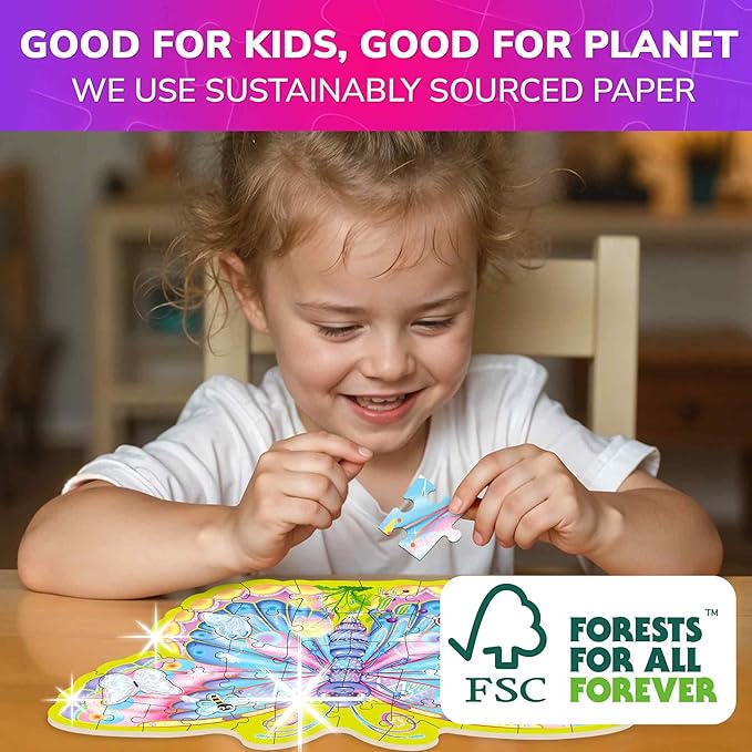 - 4 SHAPED PUZZLES WITH SHIMMER EFFECT: Includes unicorn, butterfly, mermaid, and princess puzzles with vibrant colors and foil shimmer finish; Unique shapes enhance excitement; Great fit for 50 piece puzzles for kids with visual challenge and fun twist