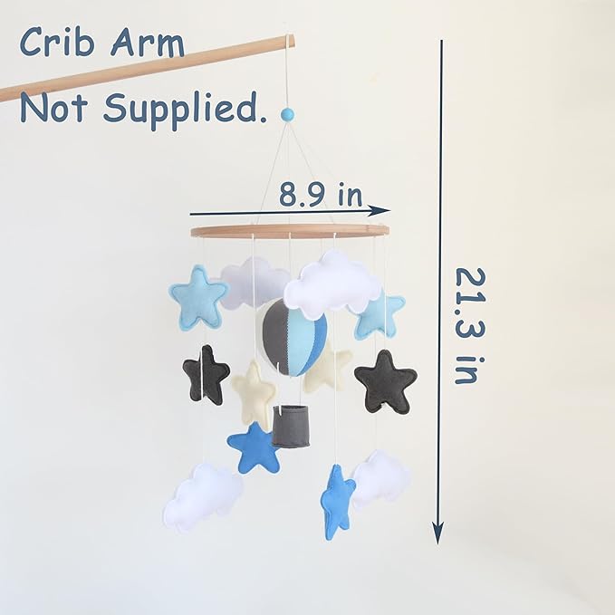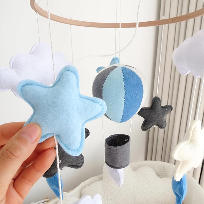 - Sky Blue Hot Air Balloon Baby Mobile is made with high quality felt, safe and soft free of foreign odors, felt mobile hot air balloon with stars and clouds.The baby mobile for bassinet is mainly in blue and white and gray colors,A circular base made of natural beech wood, with a hand carved hot air balloon suspended in the center.