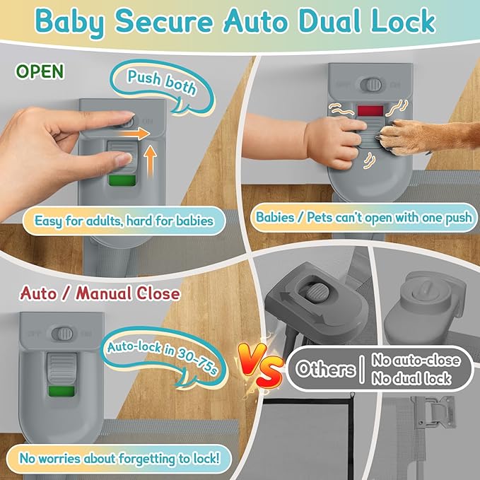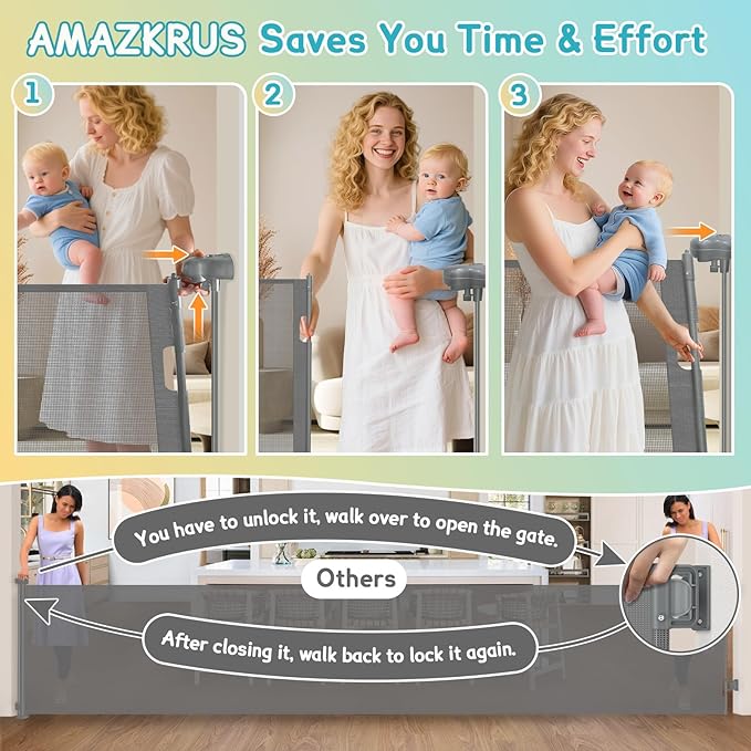 - [ Effortless Safety – Made for Busy Homes ] Unlike other gates that require unlocking on one side and opening from the other, AMAZKRUS retractable baby gates lets you unlock, open, enter, close, and lock—all with one hand from the same side. No need to walk back and forth, saving time and effort. The Baby-Security Auto Double Lock: ① More convenient! Automatically lock the gate in 30s to 75s! No more worrying about forgetting to lock the gate! ② Safer! Needs two fingers to push switches in different directions simultaneously to unlock.Difficult for babies, easy for adults. ③Note: When unlocking, the baby gate will partially retract, please do not let go.