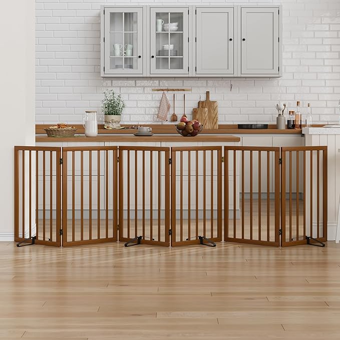 - Folding and Fully Assembled Design: this wooden dog gate quickly unfolds and folds like an accordion, flexible set up and convenient for storage. Completely assembled pet gate with gate feet support