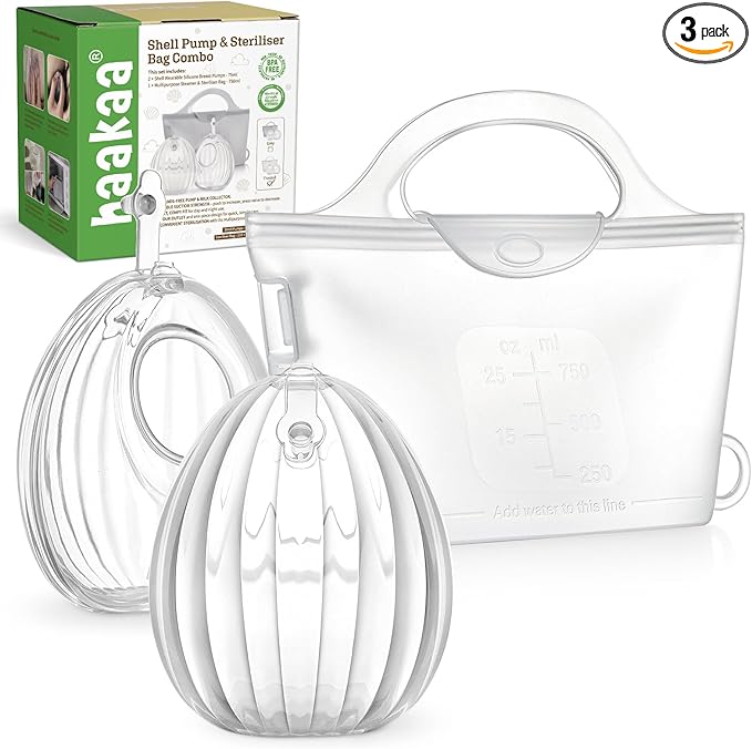 - THE PERFECT BREASTFEEDING ESSENTIALS COMBO – Combining the Haakaa Shell Manual Wearable Breast Pump and Multipurpose Microwave Bottle Sterilizer Bag, this set is ideal for breastfeeding moms at any stage.