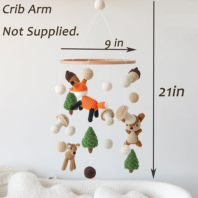 - This handmade baby mobile for crib includes charming fox, deer, and squirrel figures, crafted from Handmade crochet hook, ensuring a safe and cozy environment for your little one.