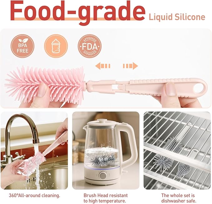 - 【Upgraded Silicone Bristles】 360° flexible silicone bristles clean better than sponge or nylon brushes - ideal for narrow-neck bottles and hard-to-reach containers.