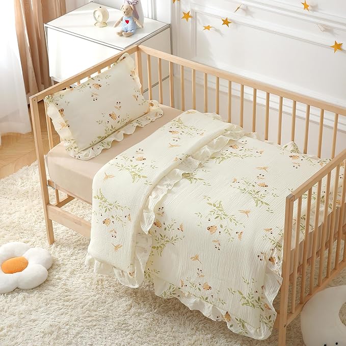 - QUALITY FABRIC AND FILLING: The outer fabric is double-layer cotton muslin fabric, which is not only super soft, breathable, skin-friendly, lightweight and very friendly to baby's delicate skin. And durability, not easy to fade, not pilling, with the growth of the use of time, but more soft and comfortable. The crib comforter is filled with a down alternative containing 20% soy fiber, the perfect weight to keep baby comfortable all year round!