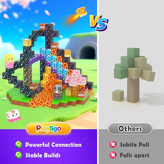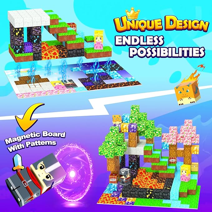 - Magnetic Board for Bigger Builds: Maximize play and expand builds! This set includes a double-sided magnetic board featuring grass and mineral designs, giving kids a stable foundation for larger, more complex structures. The clever design lets each tile go further, boosting build possibilities, expanding creative play, and minimizing clutter. Create more, build bigger!
