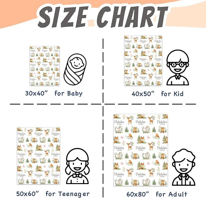 - 【Multiple Sizes】Our personalized throw blanket is available in four sizes, 30''x40'', 40''x50'', 50''x60'' and 60''x80'', making it suitable for babies, kids, teens, adults and even pets. Use the small size as a changing blanket or crib throw, and the larger sizes for snuggling on the sofa or bed with family and friends.