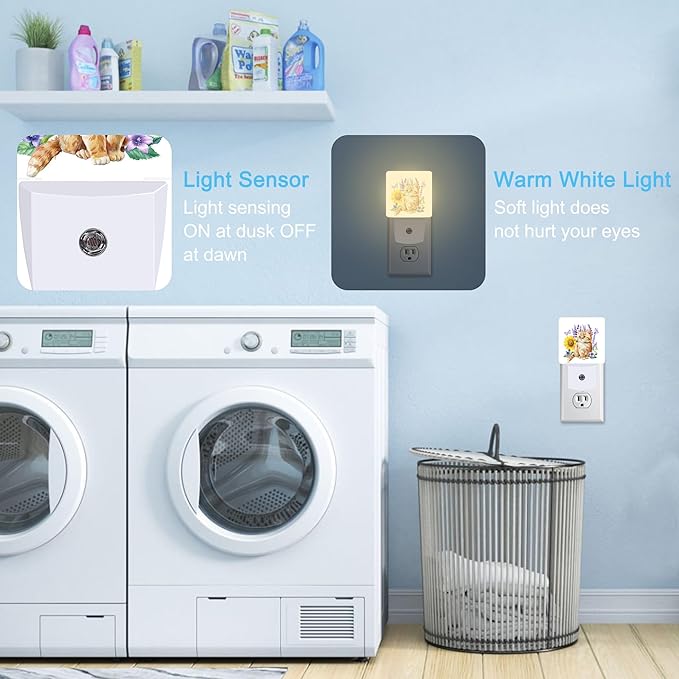 Cute Kitten and Lavender Flowers,Sunflower Butterflies Floral Plug in Night Light with Auto Dusk to Dawn Sensor,Warm Night Lights for Boys Girls Bedroom Bathroom Hallway Kids Room Gifts