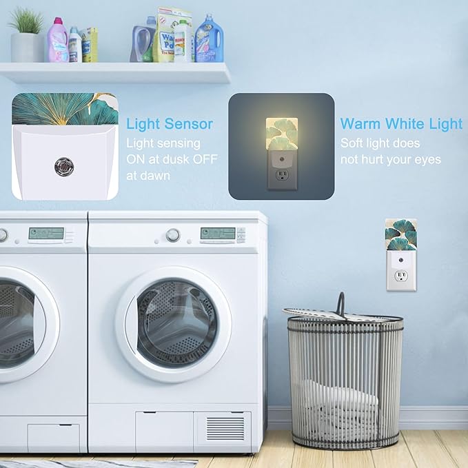 Ginkgo Leaves Green Plant Plug in Night Light with Auto Dusk to Dawn Sensor,Warm Night Lights for Boys Girls Bedroom Bathroom Hallway Kids Room Gifts