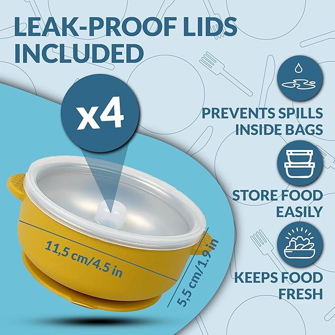 - 🍲 TIRED OF SPILLS AND MESS AT EVERY MEAL? Each bowl comes with a strong suction base and a leak-proof lid. Say goodbye to constant cleanups and enjoy calmer, stress-free mealtimes with your little one.