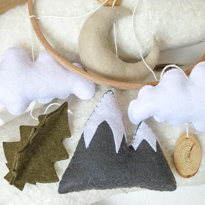 - Delight in the enchanting woodland theme of the GOUKURLSMA baby mobile for bassinet, featuring a moon, four clouds,trees and rockerys , perfect for creating a soothing nursery atmosphere for your little one.The feature of this bassinet mobile for baby is a natural beech wood ring with a beige moon hanging in the center, four white felt clouds, adorned with two pieces of beech wood. One groups of trees hanging at the bottom and handmade rockeries create a nursery mobiles baby with a forest theme.