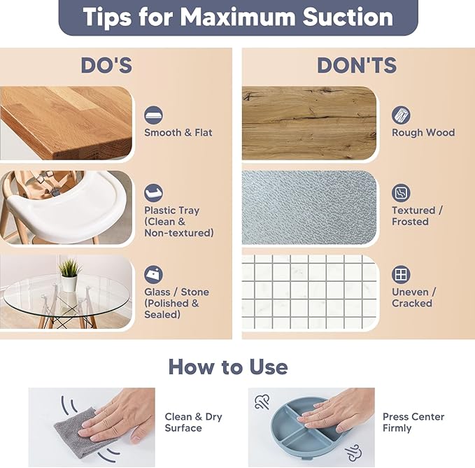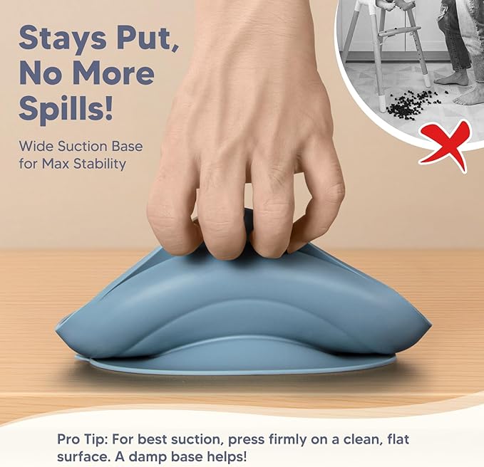 - SUCTION BASE: Strong suction cup bottom keeps plate firmly attached to table or high chair tray, preventing spills and messes