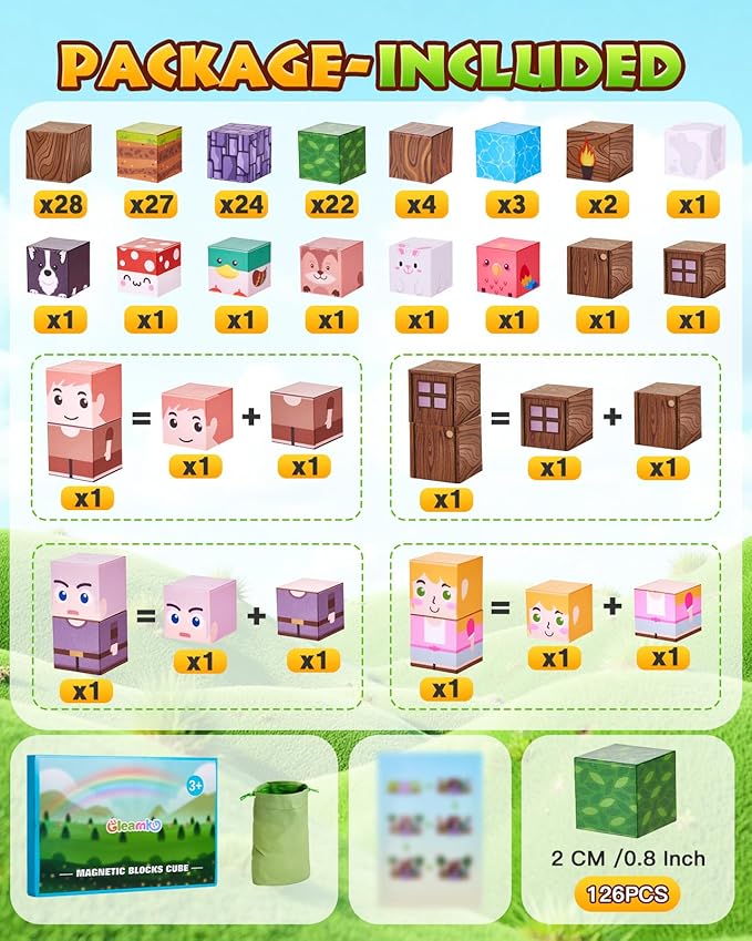 - 23 Unique Pattern Design: These magnetic blocks for kids ages 4-8 have rich patterns which is very suitable as sensory games for kids, stimulating children's creativity. With 24 different patterns of 126pcs magnetic building blocks, you can freely compose the scene you want. The manual describes the quantity and types of various magnetic cubes, and provides construction instructions to help children easily build a forest castle world.