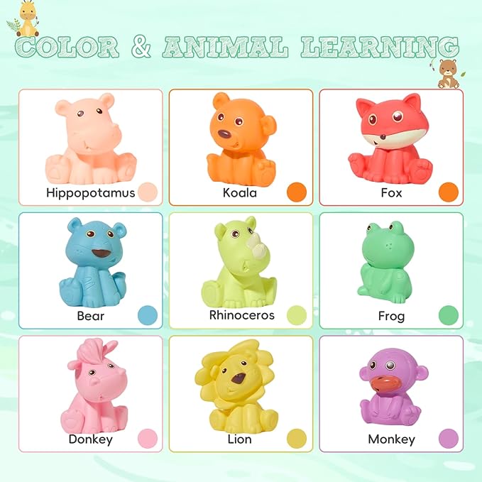 - 【9-Piece Colorful Wild Animal Bath Toys】Includes 9 adorable floating wild animals pool toys: Monkey, Lion, Bear, Frog, Hippopotamus, Rhinoceros, Fox, Koala, and Donkey. Each kids bath toy features bright, eye-catching colors to keep babies engaged and make bath time more fun and interactive