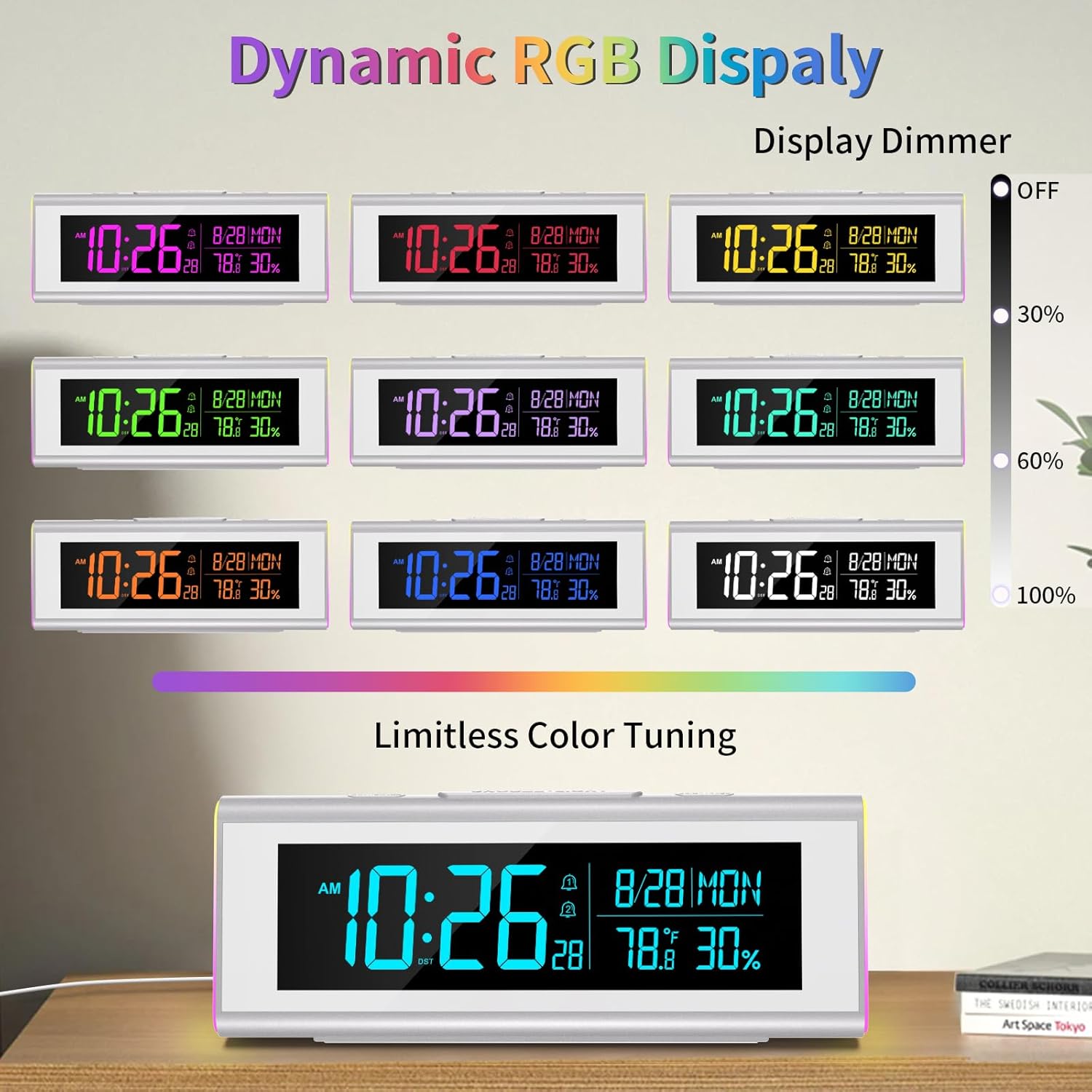 - RGB Dynamic Digital Display: Features 70 vibrant color transitions in dynamic mode or set a solid color to match your style. Choose from 3 brightness levels or turn the screen off completely to suit any environment—perfect for light-sensitive sleepers, bedrooms, or nighttime use.