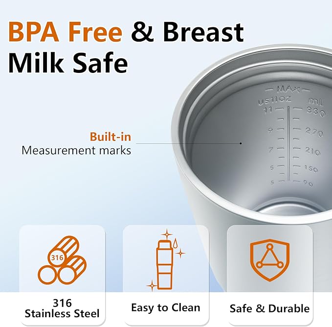 - Special Design for Travel: With a cord-free design and a perfect car cup fit, this warmer is designed for travel convenience. Whether it's for breastmilk or water, the dual heating modes are tailored to meet all your needs while on the move, making it an essential tool for parents. Crafted from food-grade 316 stainless steel, ensuring your baby’s milk stays pure and safe. Easy to clean, resistant to residue, and built for years of reliable use.