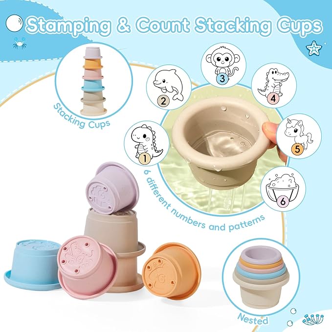 - Early Education Bathtub Toys: Kids can water, scoop, pour, float and filter with the stackable cups, bath boats, and spoon—turning every bath time into a fun learning moment. The perforated design lets water flow in playful ways, sparking curiosity. Each of the classic stacking cups kids bath toys have different animal patterns and numbers at the bottom. Babies can recognize colors, number and shapes, practice stacking, nesting, counting, and matching from this set of educational bath toys, while promote early develpoment, and developing fine motor skills, hand-eye coordination, and creativity