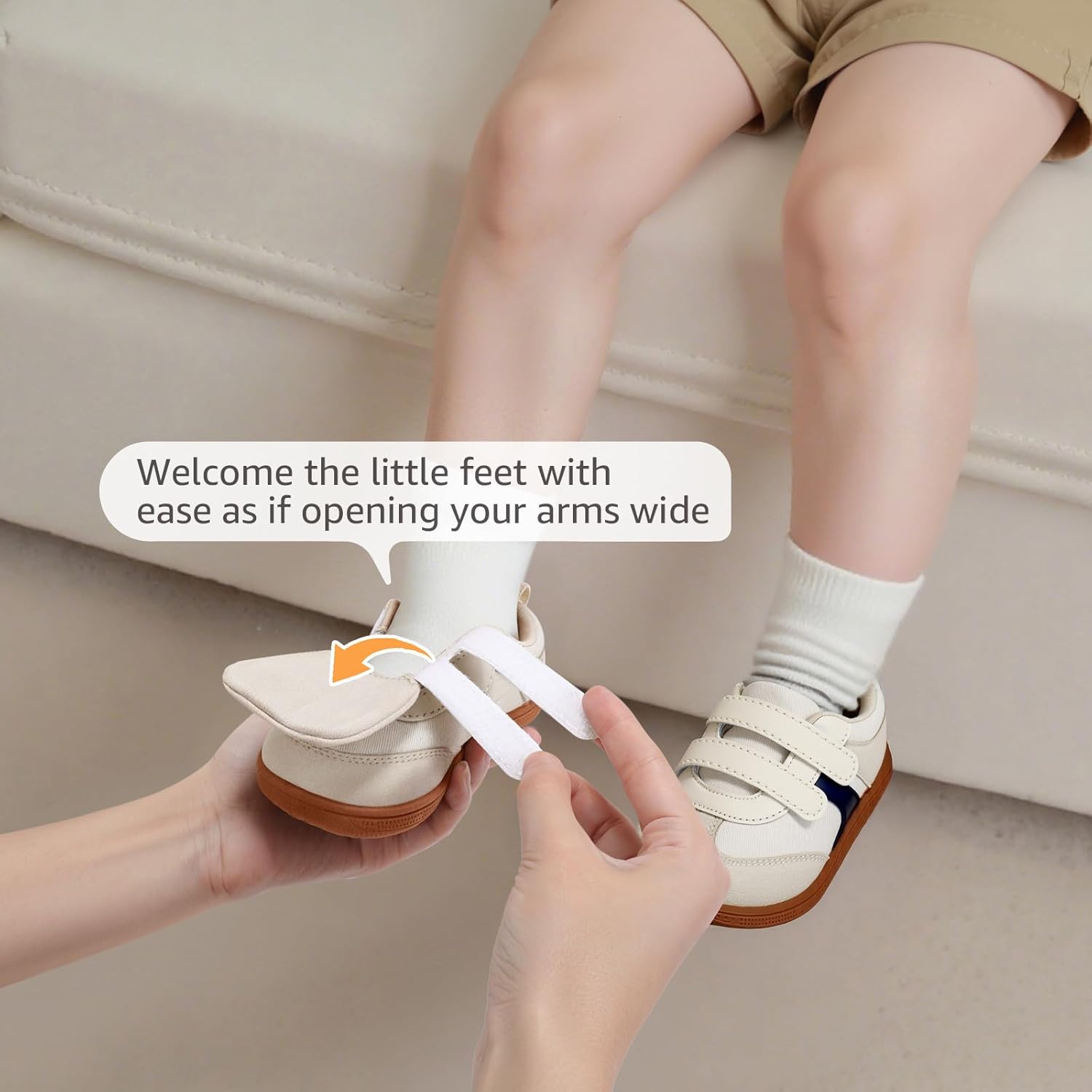 • [ Non-Slip Outsole ]: The treaded sole of these toddler first walking shoes offers excellent grip to help prevent slips and keep kids safe during play. The flexible 1/3 groove supports natural foot movement, perfect for active steps