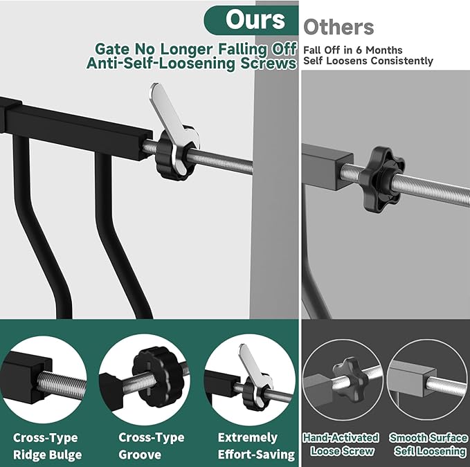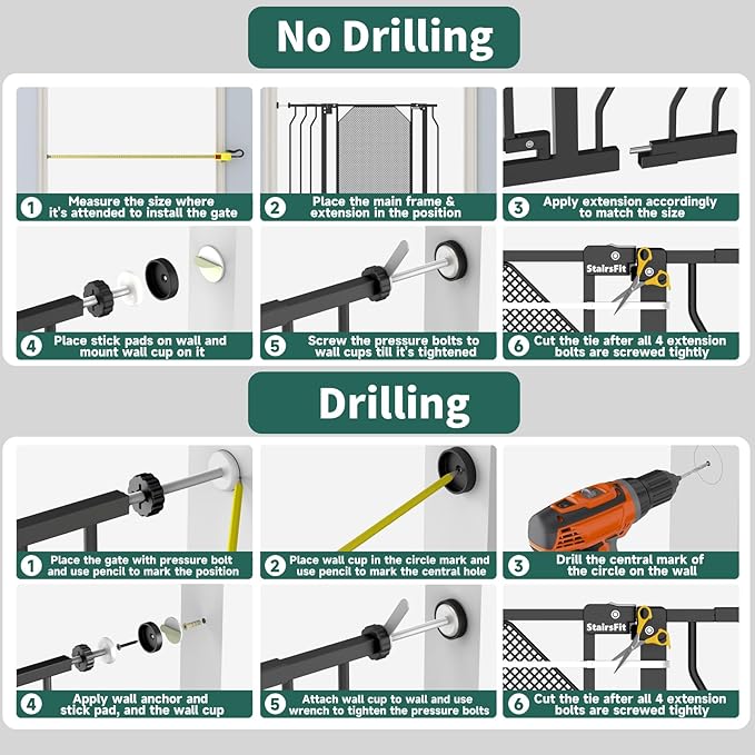 - Two Installation Options: - Pressure Mount: No Drilling required - Tool-free, no wall damage – great for hallways/doorways. - Hardware Mount: Drilling required, withstands ~200 lbs – ideal for large pets and top of stairs.