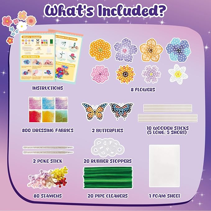 - [Creative Poke in Art]: This arts and crafts for kids have 800 fabric squares, 80 stamens, 8 flowers, 2 butterflies, 10 wooden stems (5 long, 5 short), 2 poke-in sticks, 20 pipe cleaners, and instructions. Children use “point pressing” to insert cloth pieces into the flower board, freely creating bouquets and enjoying a relaxing craft activity. Extra pipe cleaners allow kids to make 3D leaves, vines, and other decorations for more creative possibilities
