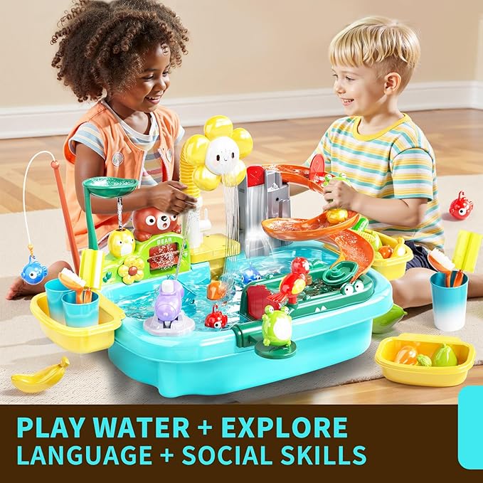 - Deluxe Water Table Playset: This toddler water table will spark your children's imagination, allowing them to dig and explore all kinds of fun water sensory activities in the play sink. It includes water park games projects, play kitchen sink and fishing game. Equipped with electric faucet, play food, color changing toy kitchen accessories, floating and fishing toys, etc., Endless fun for kids!