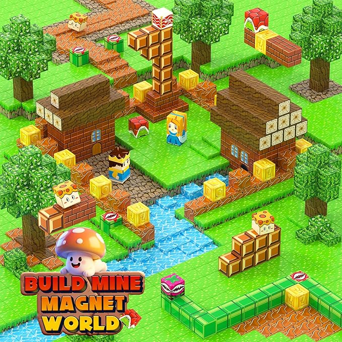 - 【RICH GAME ELEMENTS】Magnetic cubes have rich patterns, including 100 magnetic building toys of 0.8'' with 21 elements, such as wall blocks, question marks, gold coins, floor tiles, windows, mushrooms, pipes, piranha plants, grass, flags, puppets, doors, turtles, leaves, wood piles, water, etc. magnetic sensory toys allow toddler to exert more creativity in building blocks and add story elements to the building experience.