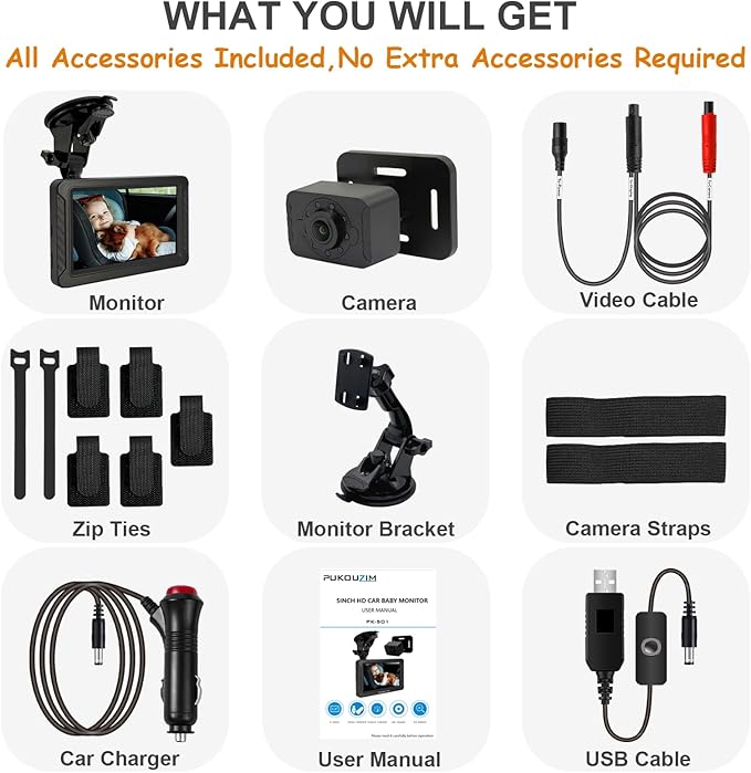 - 5-Effortless 3-Minute Installation. Our best baby camera for car requires no tools: ① Do a simple wire connection as our stickers on wire. ②Plug into USB or cigarette lighter port. ③Mounts the monitor to the windshield with suction cup. ④Tie the camera on car headrest and adjust the backseat camera for baby angle in seconds.