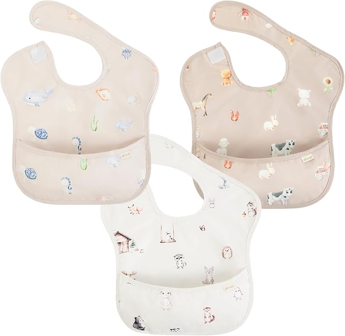 • EASY-to-USE waterproof short sleeved bib for toddlers easily wipes clean. Food catching bib for mealtime, smock baby bibs for eating, smock bib set perfect for your little one. Adorable color combinations