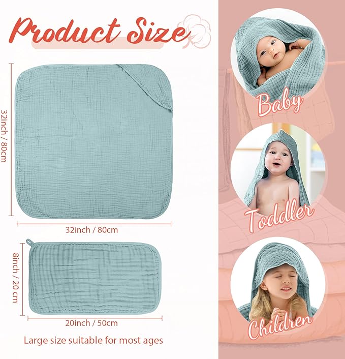 - Absorbent Infants Bath Towels: the baby bath towels and washcloths in this set boast 6 layers of muslin cotton; The quality muslin baby towels are adept at absorbing moisture from your baby's body quickly, ensuring they are dry and cozy after their bath; This ultra absorbency feature distinguishes these infant towels from the competition, making it the smart and efficient choice for baby care
