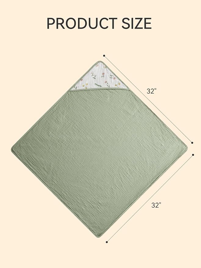- Perfect Size with Snug Hood: The roomy 32-inch square design provides full-body coverage, while the attached hood keeps baby's head warm and dry after bath time - no more post-bath chills!