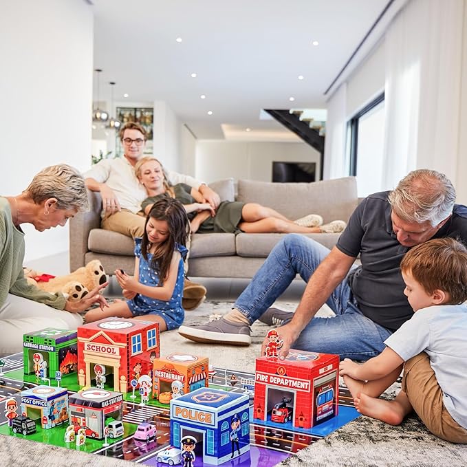 - Interactive City Adventure with Play Mat:The included city mat transforms your space into a lively urban scene, letting people simulate real-life traffic and daily routines. People can drive vehicles, arrange road signs, and place characters at their matching buildings for hours of pretend play and storytelling