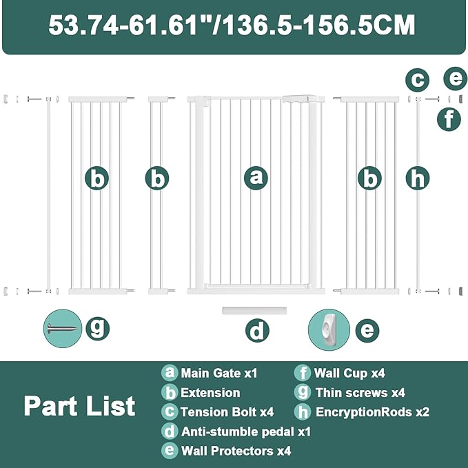 - Easy to install: The pet gate extra tall is pressure-mounted(4 adjustable pressure bolts),no drilling no tools can be quickly installed. It comes with special wall protection pads that do not damage walls-more secure. Note: please don't cut the tie until you successfully install the gate . The baby gate extra wide is suitable for widths ranging from 30 inches to 77 inches. To ensure that the width of the door matches the size of the gate, please measure the opening size before purchasing.