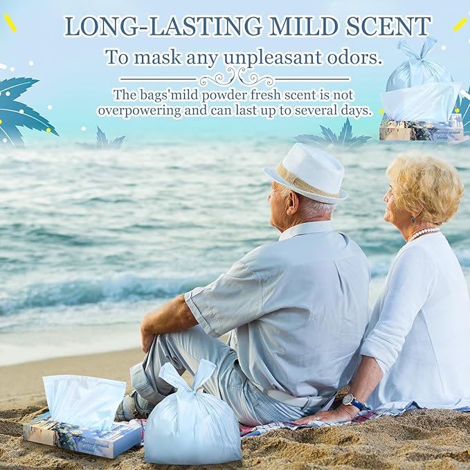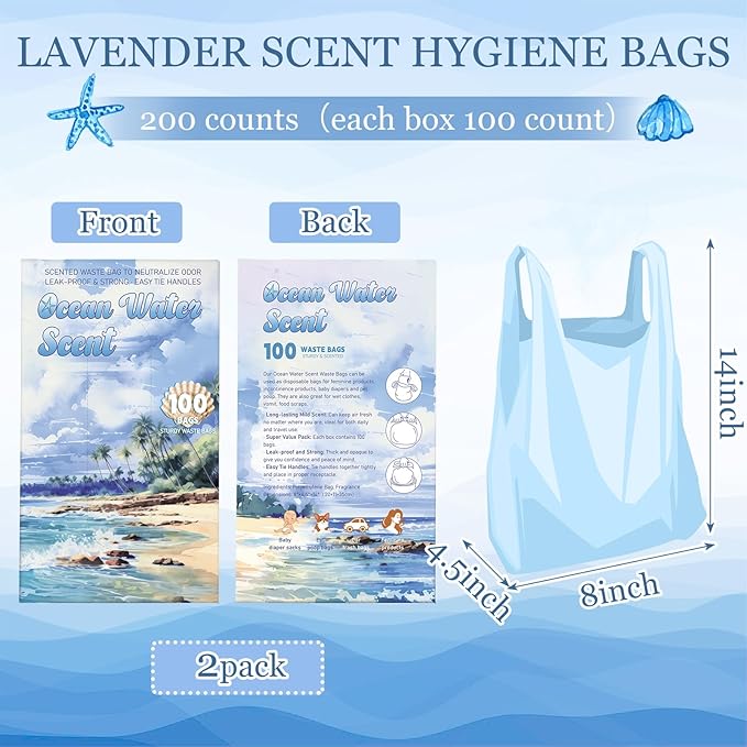 - Ocean Water Scented Trash Bags: infused with Ocean Water Scented, these diaper trash bags help neutralize unpleasant odors from sanitary napkins, adult incontinence products, and diapers, ensuring a fresh, odor-free environment
