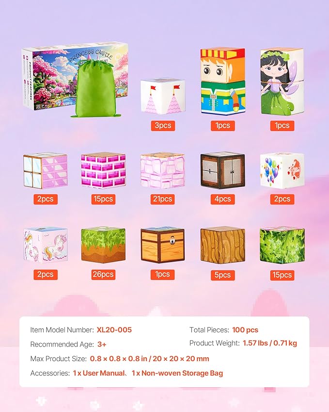 VEVOR Magnetic Blocks, 100 PCS Princess Castle Set, Magnetic Building Cubes for Kids, STEM Montessori Sensory Toys for Christmas Birthday Gift, Construction Stacking Toy for 3+ Years Old Boys & Girls