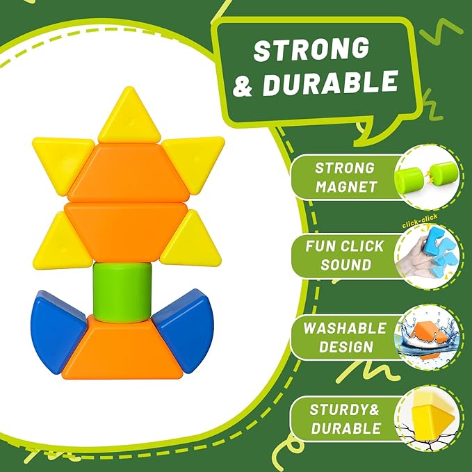 - Includes 20 magnetic blocks in 7 vibrant colors and 8 fun shapes, inspiring kids’ imagination and hands-on creative play