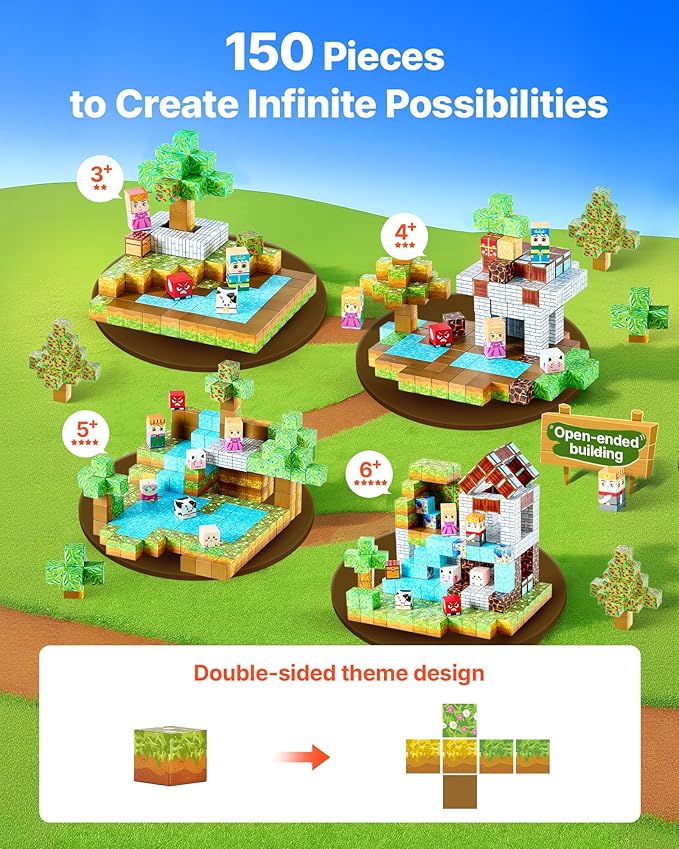 - 【Freeform Building & Dual-sided Themes】 With 150 magnetic blocks and dual-sided themes, your child can create flat designs, 3D structures, and even iconic recreations! Mix and match with other magnet blocks sets to build new stories