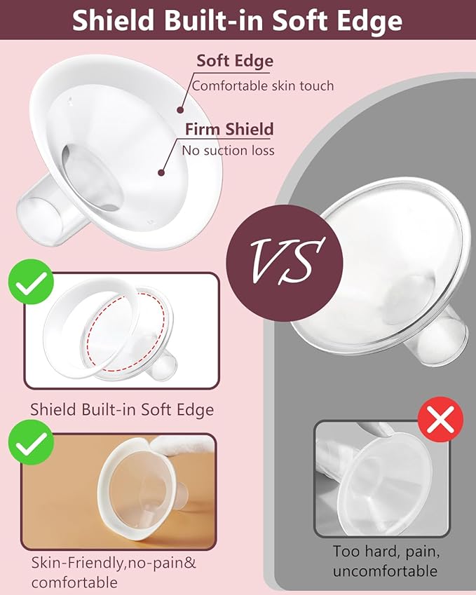 - 【Soft Silicone Edge, efficiency&Comfort Pumping】:Our breast shields built-in super soft silicone extension to hard shield, soft around your breast , providing more comfortable and painless pumping for moms, and helping moms more milk than pumping with traditional breast shields. so you can maximize your pumping efficiency and optimize milk output.
