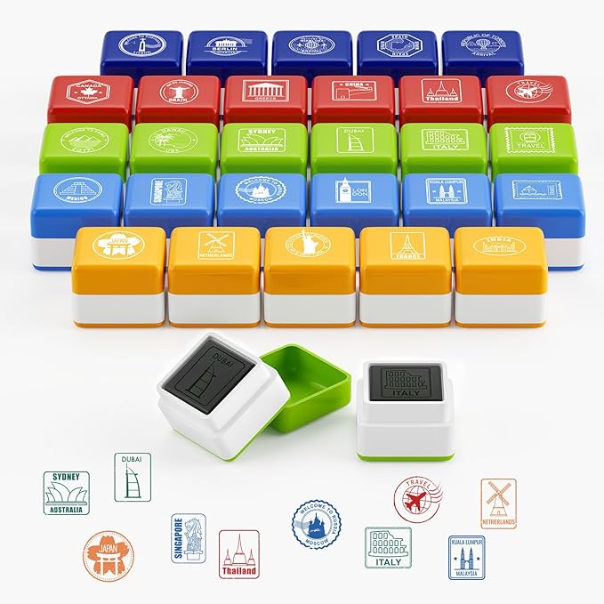 - 28-piece world travel stamp set – This passport stamp set includes 25 unique country and city stamps such as Egypt, Hawaii, Sydney, Dubai, Italy, Canada, Brazil, Greece, China, Thailand, Mexico, Singapore, London, Japan, the Netherlands, New York, France, India, Portugal, Germany, Miami, Spain, Turkey, and Malaysia, along with 3 travel mode stamps: airplane, ship, and railway.