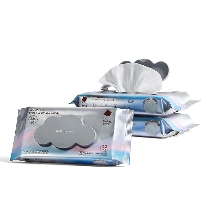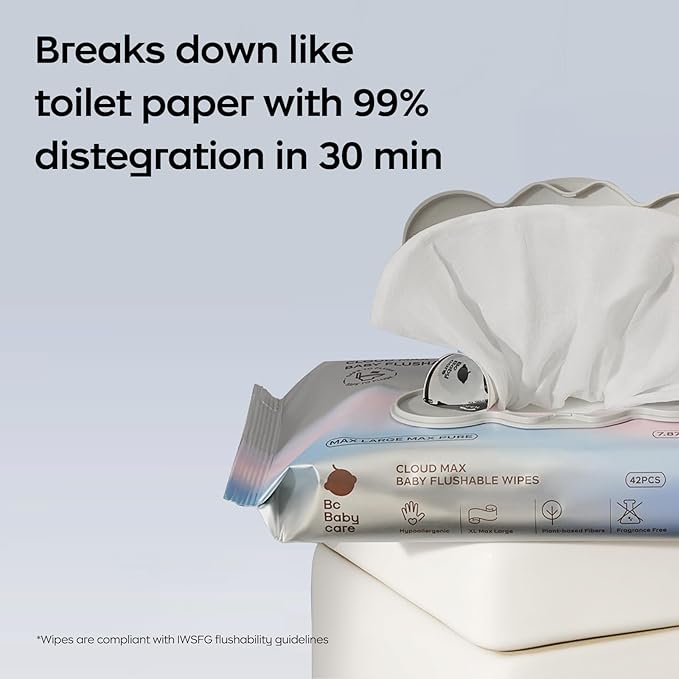 Bc Babycare Flushable Wipes, Hypoallergenic for Sensitive Skin, 99% Water, Plant-Based Fibers, Sewer + Septic Safe, Fragrance Free Toddler Potty Training, 42 Wipes, 3 Packs
